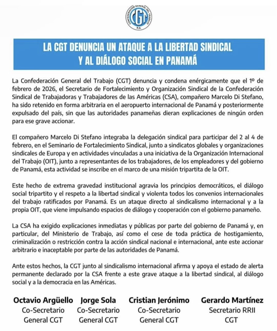La Confederación General del Trabajo (CGT) emitió un duro comunicado en el que denunció el accionar del gobierno panameño como "arbitrario e inaceptable", señalando que se trata de un ataque directo al sindicalismo internacional, al diálogo social tripartito y a la propia OIT. En el texto, la central obrera exigió explicaciones inmediatas y públicas y el cese de toda práctica de hostigamiento contra la acción sindical.