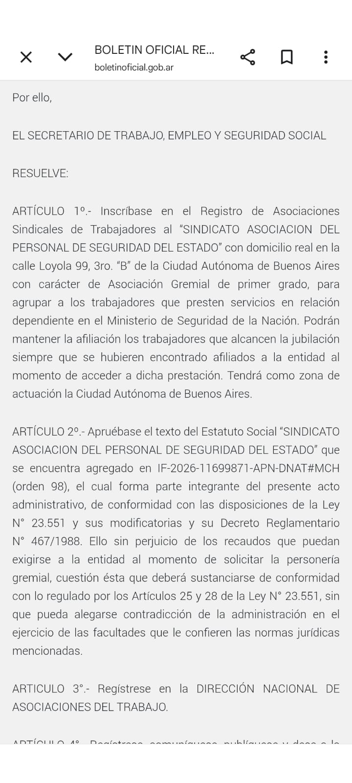 Hay un nuevo actor en el mapa sindical del Estado nacional. El Sindicato Asociación del Personal de Seguridad del Estado obtuvo su inscripción gremial mediante la Resolución 316/2026 de la Secretaría de Trabajo, publicada este 27 de abril en el Boletín Oficial. Agrupa a los trabajadores en relación de dependencia del Ministerio de Seguridad de la Nación, con sede en la Ciudad Autónoma de Buenos Aires.
