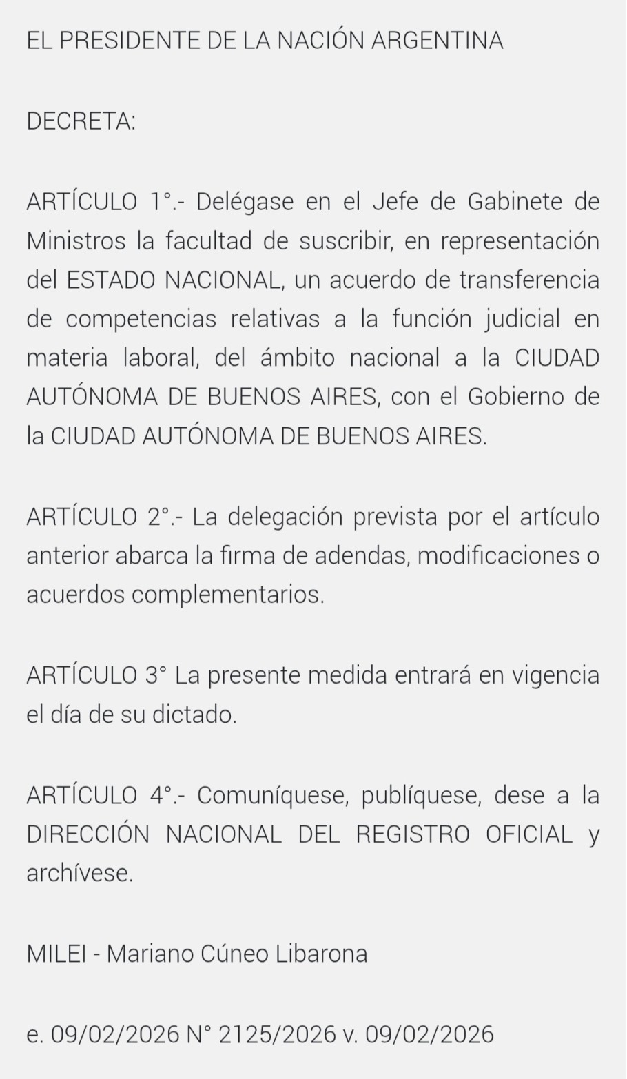El decreto delega en el Jefe de Gabinete la facultad de suscribir acuerdos de transferencia de competencias judiciales en materia laboral, desde el ámbito nacional hacia la Ciudad Autónoma de Buenos Aires, incluyendo adendas, modificaciones y acuerdos complementarios. Además, establece que la medida entra en vigencia el mismo día de su dictado, sin necesidad de debate parlamentario.