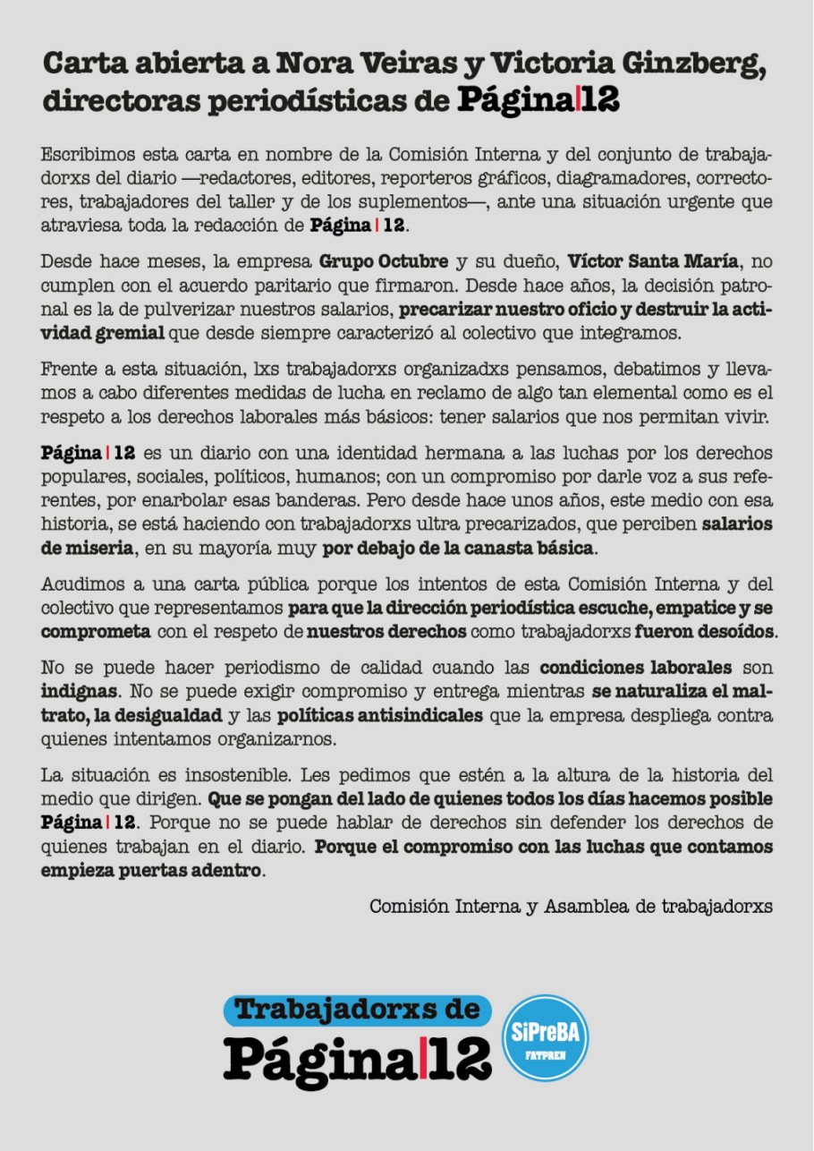 "Les pedimos que estén a la altura de la historia del diario que dirigen. Que se pongan del lado de quienes todos los días hacemos posible Página/12. Porque no se puede hablar de derechos sin defender los derechos de quienes trabajan en el diario".